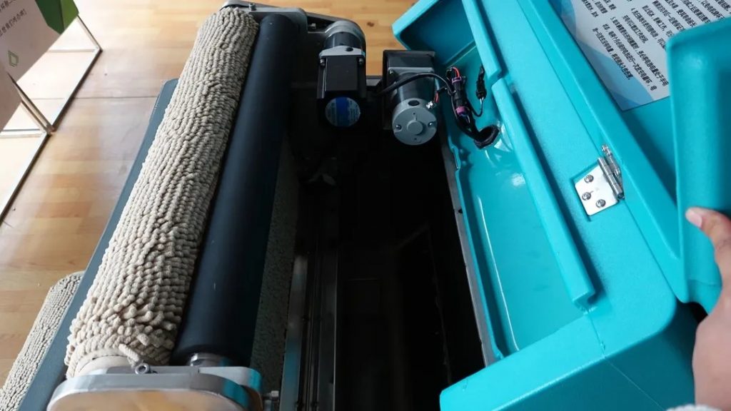 吸過水的拖布通過車內部循環系統,被洗滌輥擠干水流進水箱